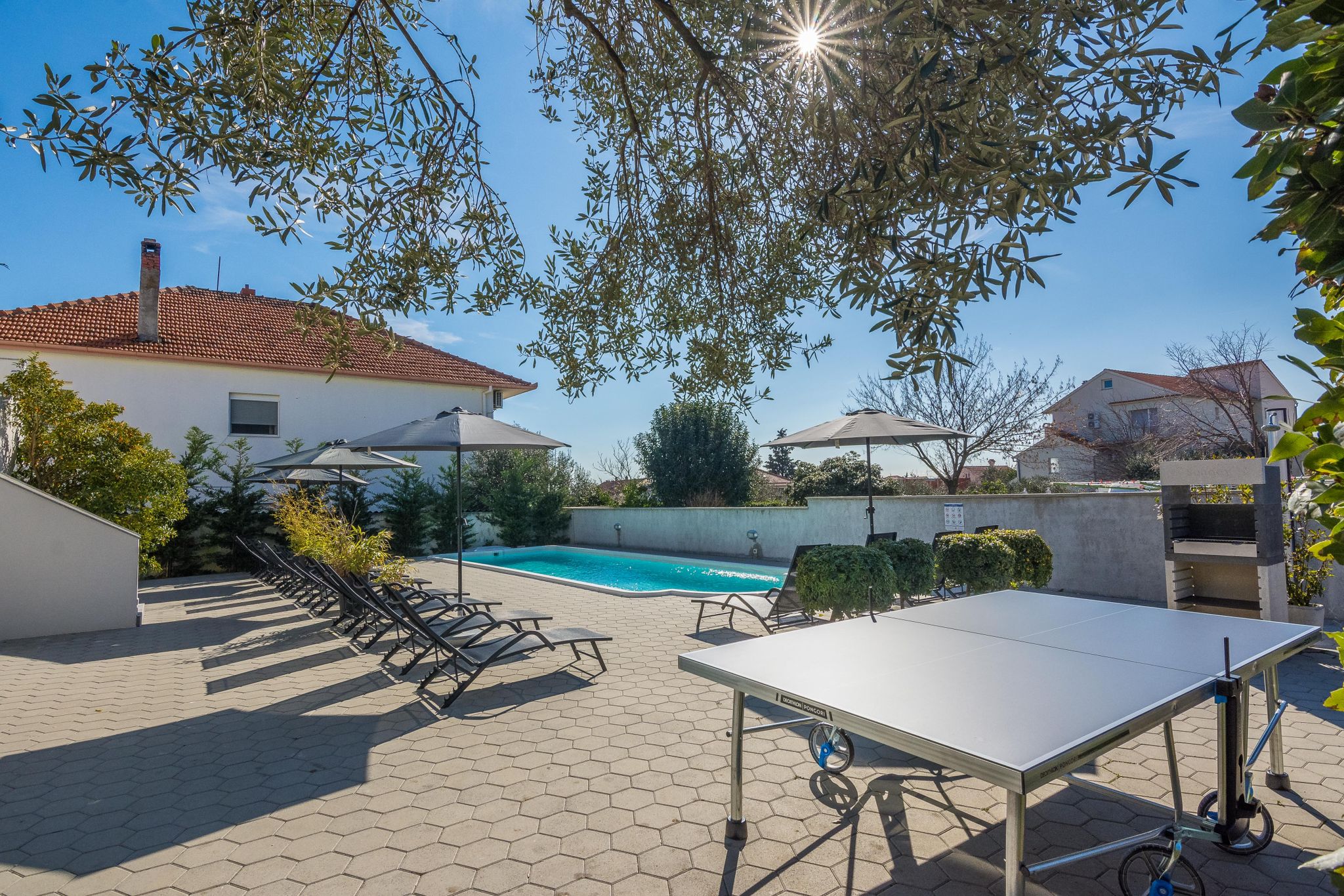 BAZEN se nalazi na sunčanom djelu dvorišta. Bazenska voda se tretira sa morskom soli i bogata je mineralima te je zdravija od vode koja se tretira klorom. Bazen je grijan,od kraja ožujka do kraja listopada ( garantirana temperatura vode od 26 C- 28 C ovisi o vremenskim ujetima). Na plaži su ležaljke i suncobrani. PARKING je besplatan, dostupno je 5 parkirnih mjesta.