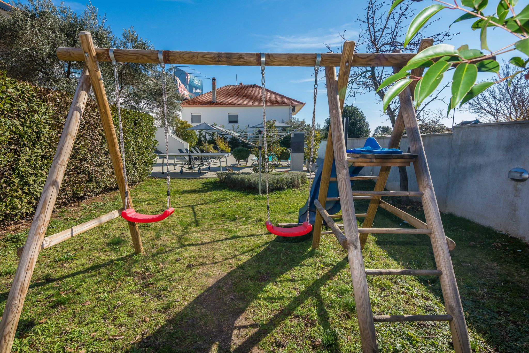VRT je veličine preko 890 m2. Kompletno ograđen. Iza živice je ograda i zid. U dvorištu se nalazi grill ( drveni ugljan ). Prekrasan vrt sa travnjakom i dječijim igralištem okružen je maslinama i mediteranskim biljem. Vrt je projektiran da gost ima potpunu privatnost i zaštitu od pogleda.