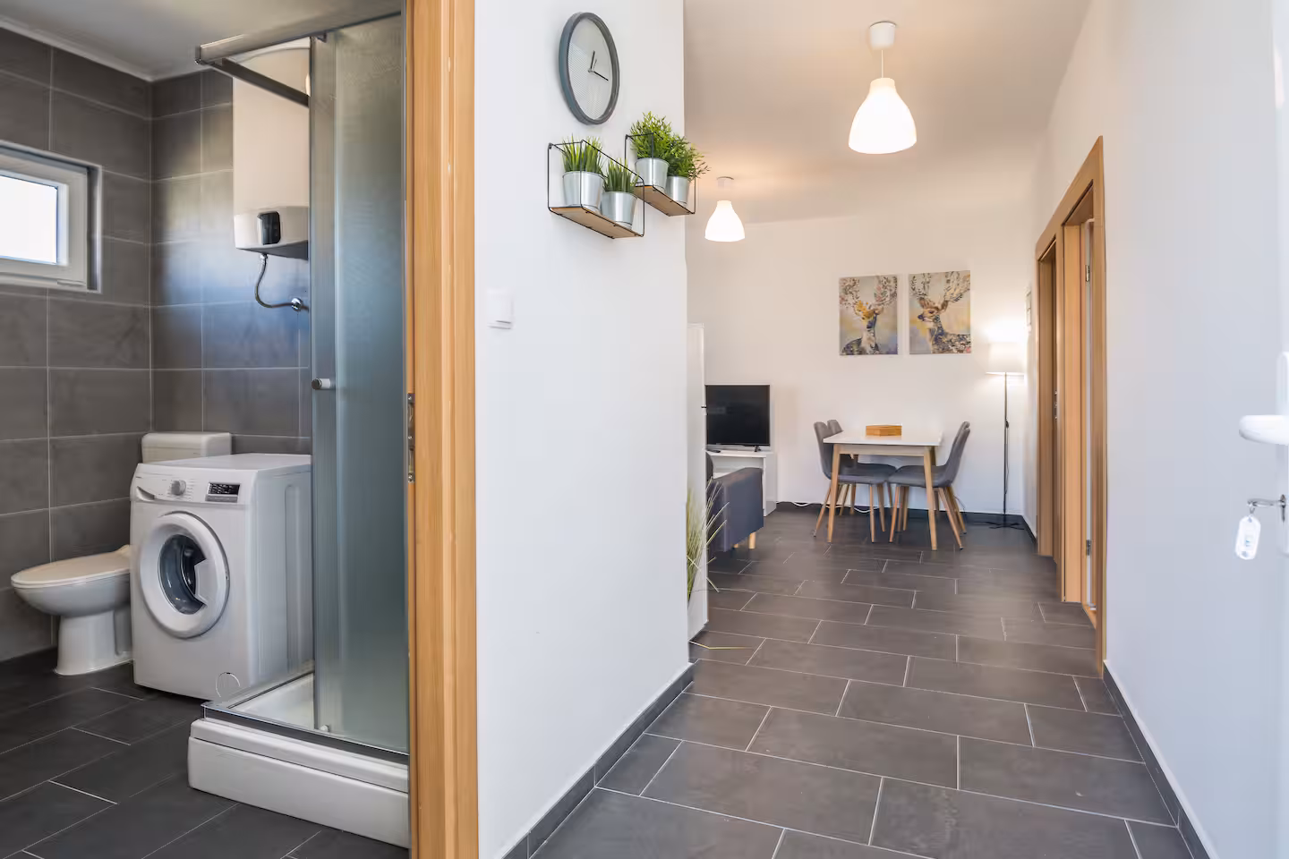 Moderna kupaonica s walk‑in tušem, perilicom rublja i svim potrepštinama.